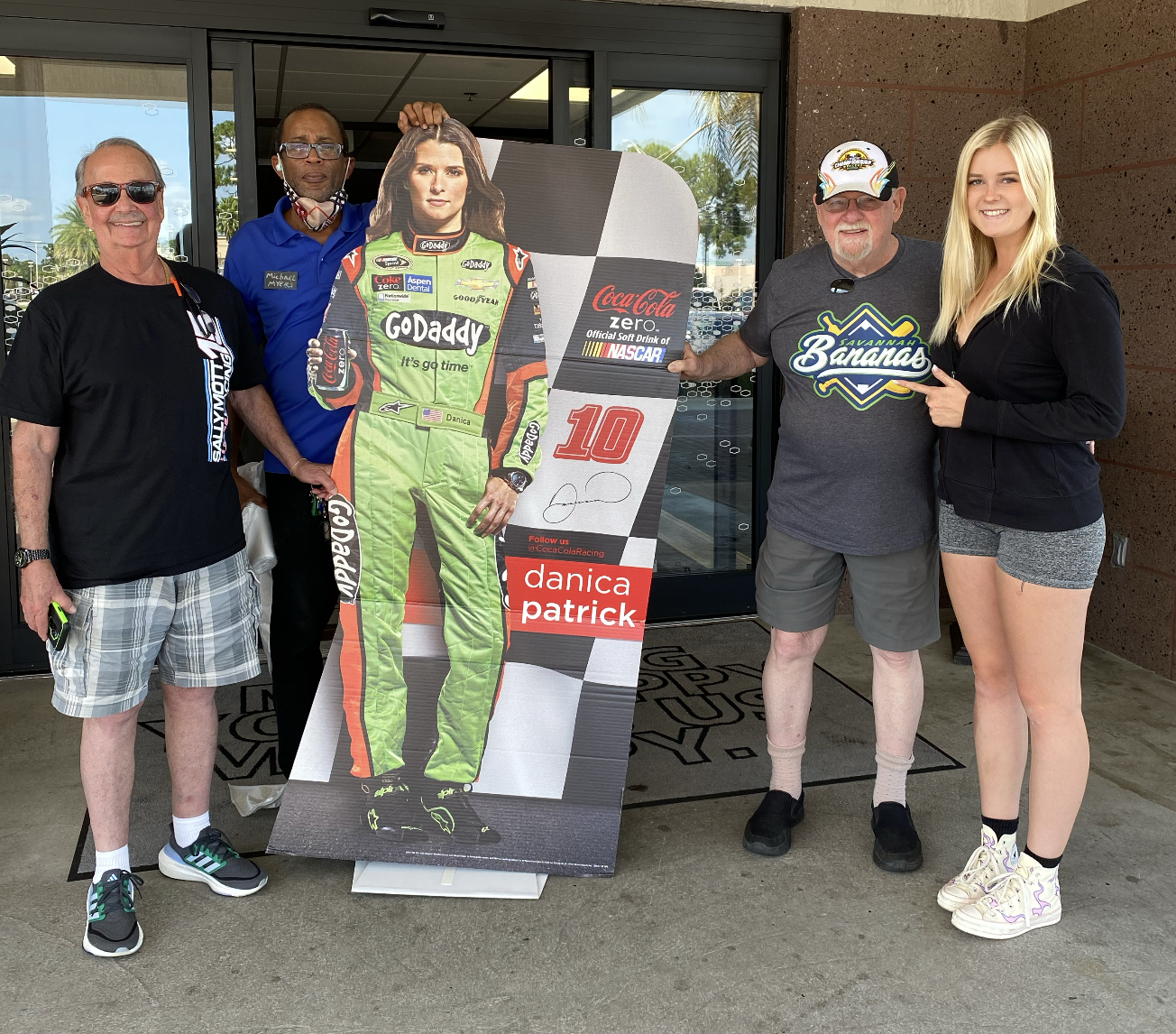 Larry Pyle (to my right), Glen (on the left), our favorite hotel employee, a Danica Patrick life size cut out, and I!